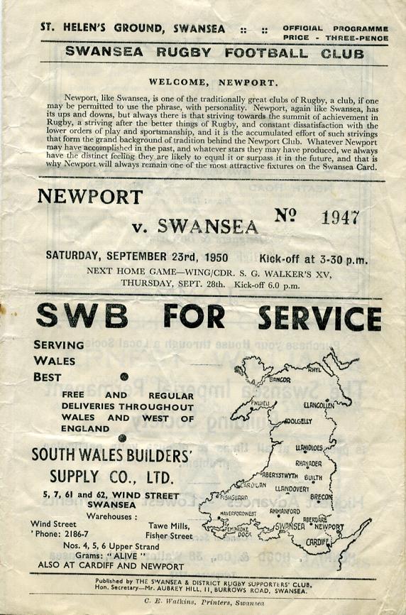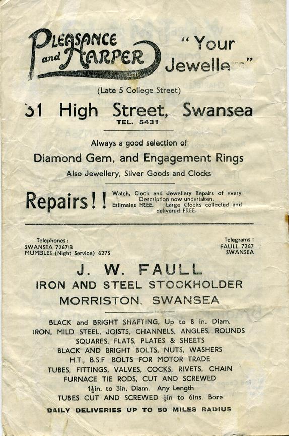 "Full membership of the Swansea Rugby and Cricket Club costs £2-2-0. Why not change from the 30/- to the 42/- membership this season? I know the cricket is over and you have lost half the value already, but the idea has its points, besides being a substantial gesture of goodwill to the Club. You would be entitled to partake in any or all of the Club's activities, Football, Cricket, Hockey and Athletics, with full voting powers at the Club Annual Meeting and all the Sectional Annual Meetings. It entitles you to apply for membership of the Swansea Sports Club. If you are of the kind that relishes the rectitude of the committee-room where the gentle zephyrs of controversy blow, remember that full membership is the constitutional pathway to managerial hierachy. For certain committees the Club rule book demands two years full membership of applicants. Both Mr. Prosser and Mr. Grimshaw assure me that if any 30/- member desires to transfer the resultant clerical labour will be joyfully undertaken. Although the spirit behind this Club is as solid and as purposeful as it has ever been, and although you may cheerfully discount the despondent headlines, always remember that financial difficulties could leave us high and dry if ever things became difficult. No financial gesture to the Club is wasted, from your three pennies for a programme to your 42/- for full membership, and never forget that."