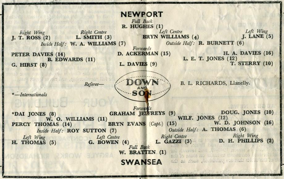 "Newport, like Swansea, is one of the traditionally great clubs of Rugby, a club, if one may be permitted to use the phrase, with personality. Newport, again like Swansea, has its ups and downs, but always there is that striving towards the summit of achievement in Rugby, a striving after the better things of Rugby, and constant dissatisfaction with the lower orders of play and sportsmanship, and it is the accumulated effort of such strivings that form the grand background of tradition behind the Newport Club. Whatever Newport may have accomplished in the past, and whatever stars they may have produced, we always have the distinct feeling they are likely to equal it or surpass it in the future, and that is why Newport will always remain one of the most attractive fixtures on the Swansea Card."