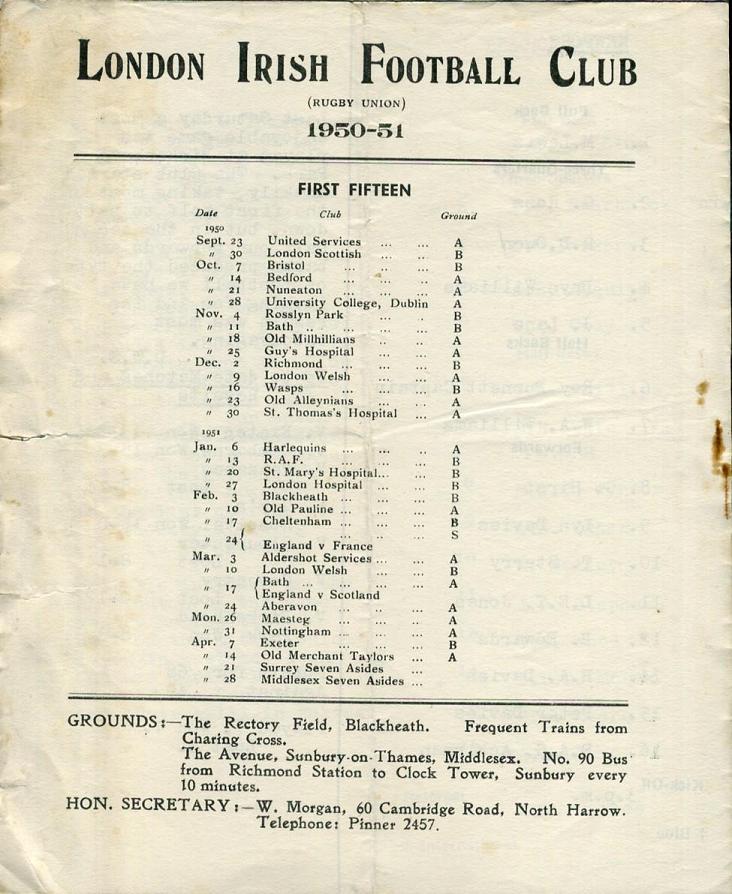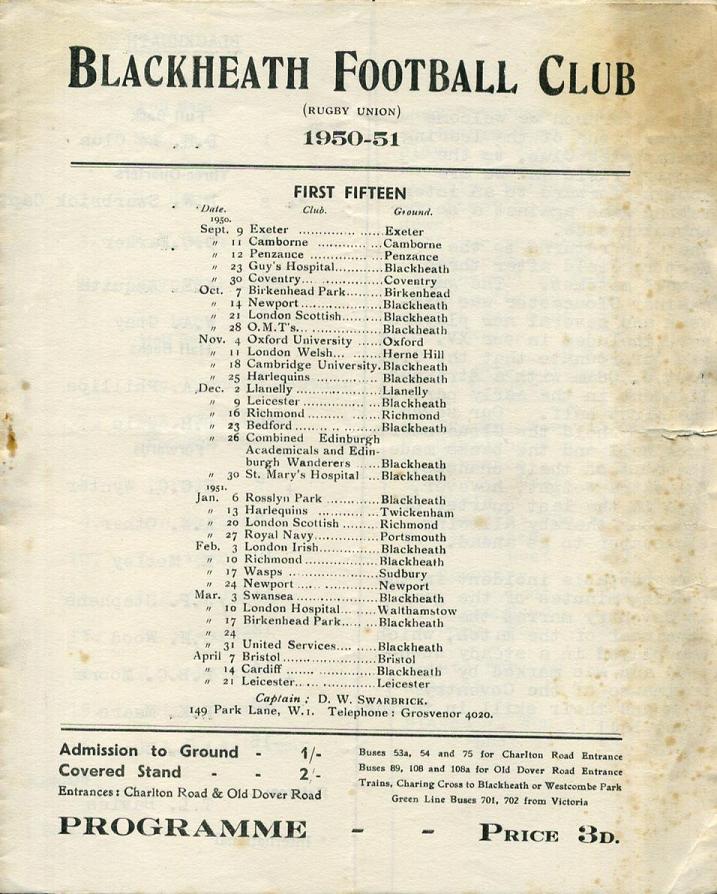 "BLACKHEATH.- D. H. Le Clus; W. A. Gray, A. E. Asquith, D. C. Parker, D. Swarbrick; G. A. Phillips, D. H. Gale; A. A. Dunn, R. K. Mears, P. B. C. Moore, G. N. Wood, J. P. Stephens, K. Morley, R. Shackanovis, E. C. C. Wynter."