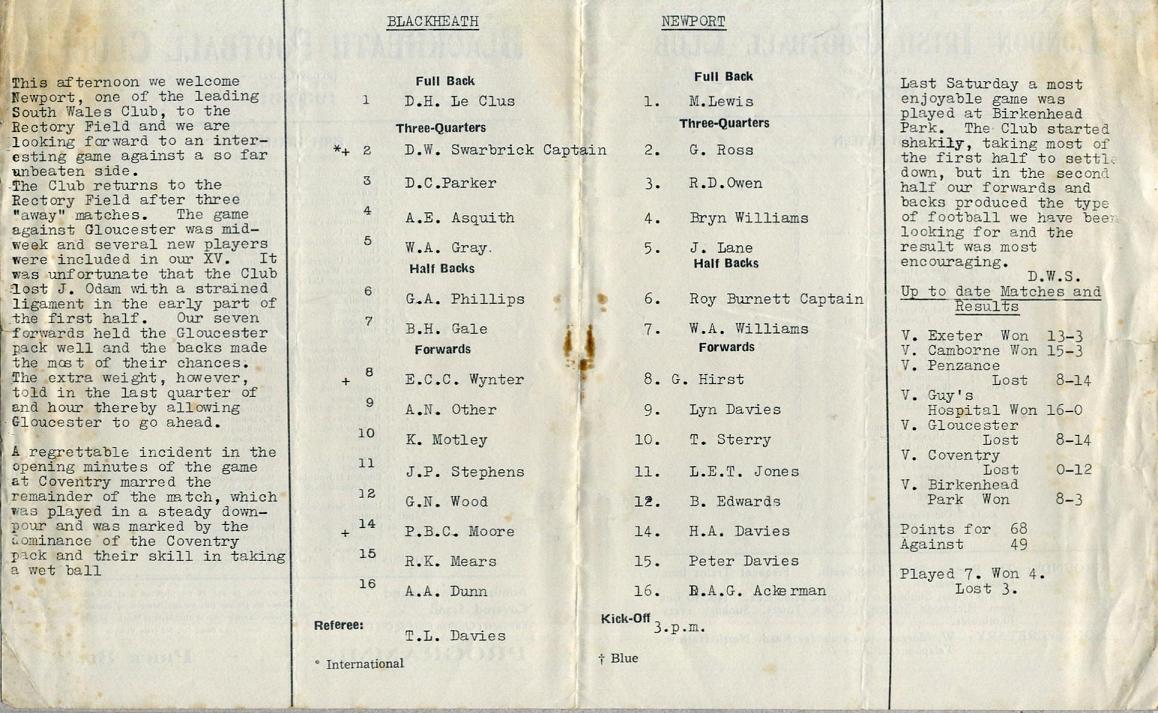 "It was a pleasant afternoon and "The Club," for all another defeat, had the satisfaction of knowing that their form this season was continuing to attract a fairly large crowd of supporters. Newport, of course, as an undefeated side, with victories at Cardiff and Swansea to their credit, were interesting opponents. Yet, although it cannot be suggested that Blackheath ever looked like breaking the Newport record, there might, in fact, have been an exciting finish but for the remarkable cleverness of the Newport drop-kickers.. Little Burnett, the stand-off player, got two, and B. Williams, at centre, landed one in addition to n excellent try."