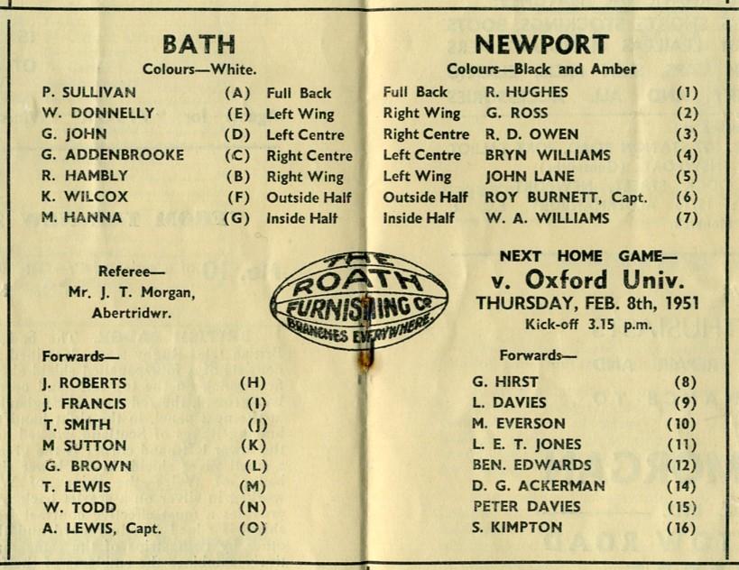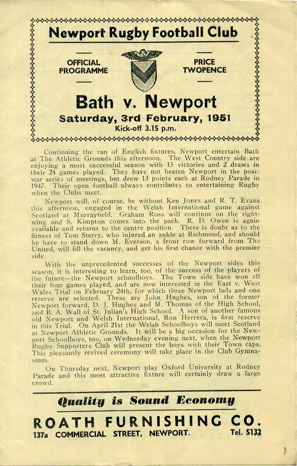 "Continuing the run of English fixtures, Newport entertain Bath at The Athletic Grounds this afternoon. The West Country side are enjoying a most successful season with 15 victories and 2 draws in their 24 games played. They have not beaten Newport in the postwar series of meetings, but drew 13 points each at Rodney Parade in 1947. Their open football always contributes to entertaining Rugby when the Clubs meet."