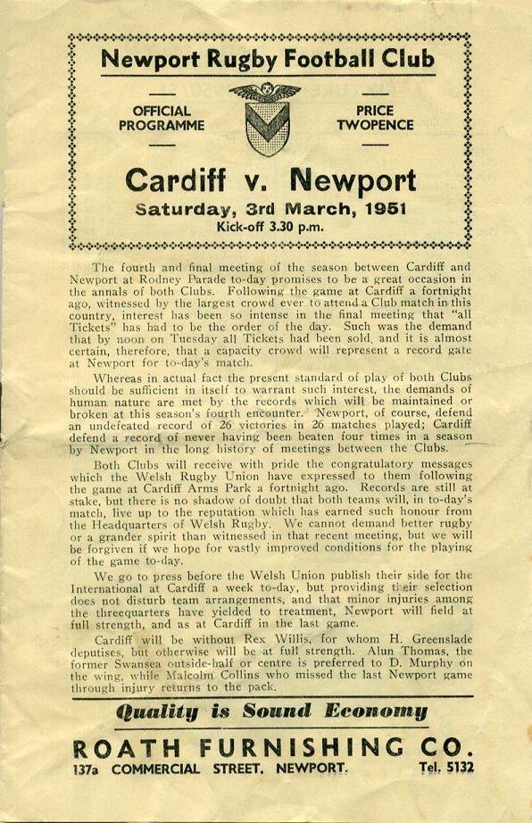 "Whereas in actual fact the present standard of play of both Clubs should be sufficient in itself to warrant such interest, the demands of human nature are met by the records which will be maintained or broken at this season's fourth encounter. Newport, of course, defend an undefeated record of 26 victories in 26 matches played; Cardiff defend a record of never having been beaten four times in a season by Newport in the long history of meetings between the Clubs."