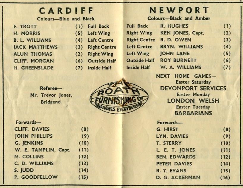"Cardiff will be without Rex Willis, for whom H. Greenslade deputises, but otherwise will be at full strength. Alun Thomas, the former Swansea outside-half or centre is preferred to D. Murphy on the wing, while Malcolm Collins who missed the last Newport game through injury returns to the pack."