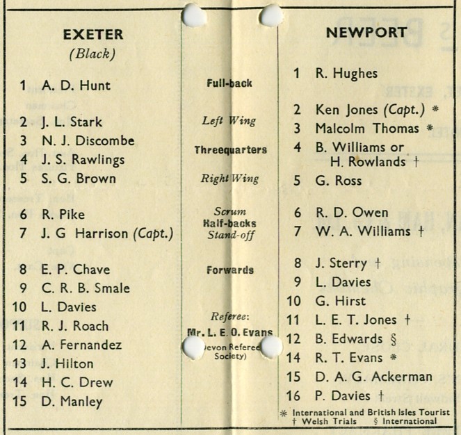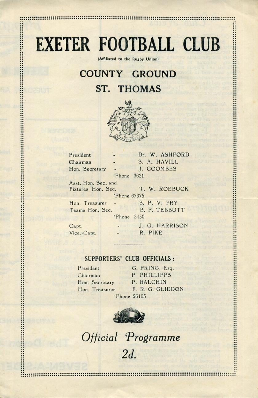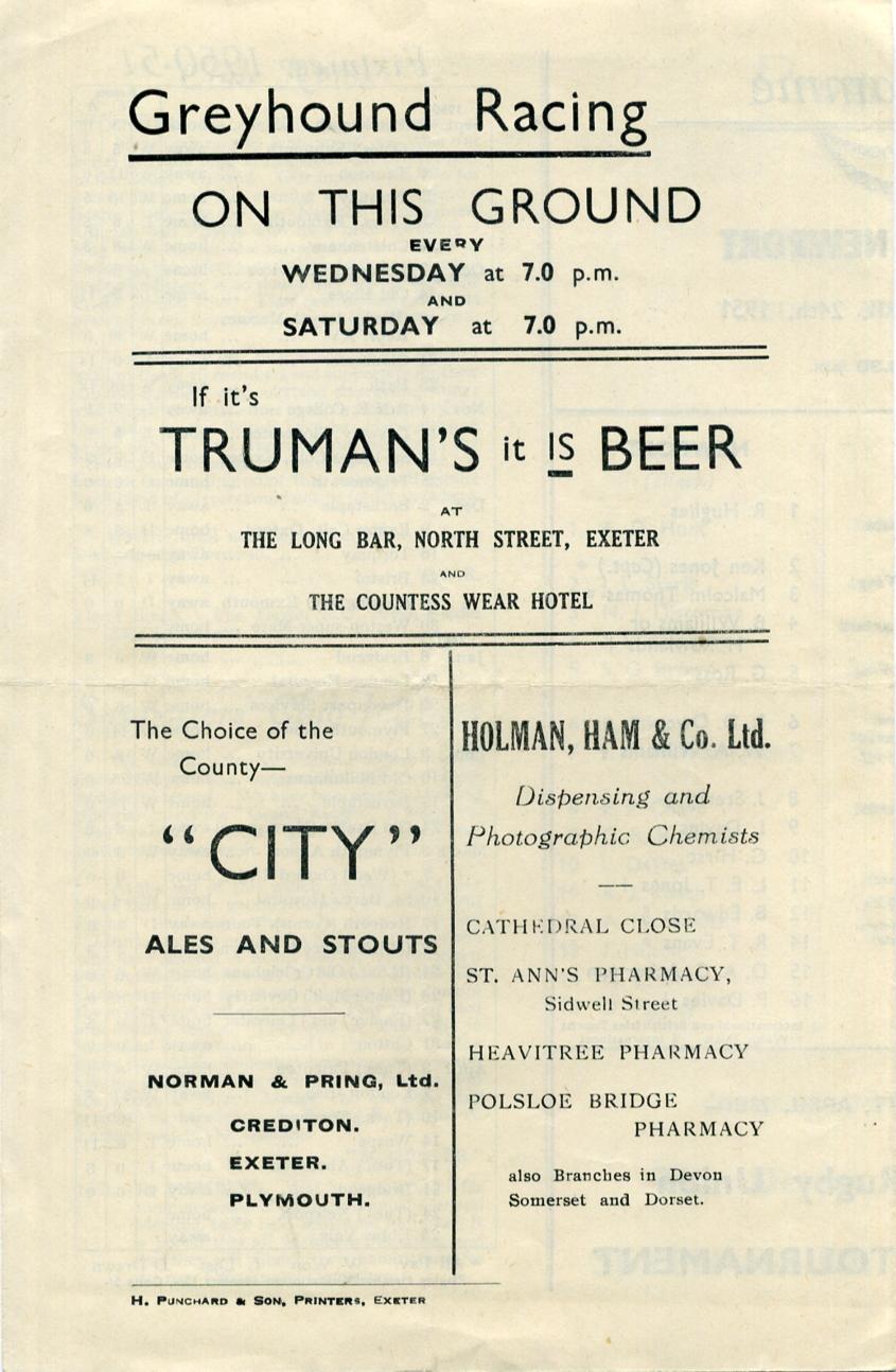 "TO-NIGHT we conclude our programme of home games and who could we wish for better than the long anticipated visit of Newport to the County Ground. Our supporters are in for a very fine game this evening and we do extend a hearty welcome to the Newport Committee, Officials and Players who have been spending a long week-end in Devon, we wish to extend to them our hearty congratulations on their successful season and there is no doubt they are the best side in the British Isles. They beat us fairly easy last season but our boys voted it the best game they had."