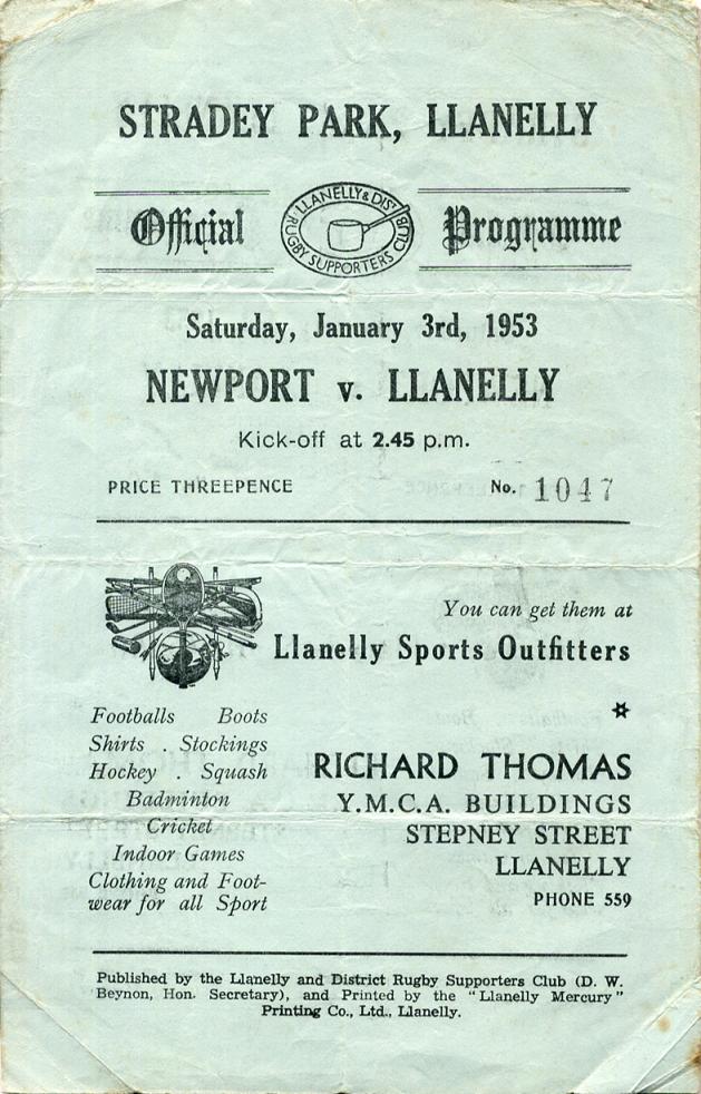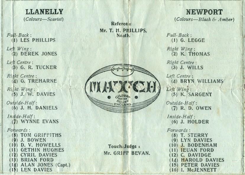 "Whilst the absence on trial duty of players Ken Jones, Malcolm Thomas, Billy Williams and R. Burnett is certainly disappointing, the visit of Newport to Stradey is still enough to excite us with the prospect of a grand game of Rugger. The Usksiders are always welcome to the "Classy Slopes" and even without the top liners are certain to provide high-class football. Garry Legge, who has shown remarkably good form at full-back for the visitors, will shortly leave for service in Germany with the South Wales Borderers."