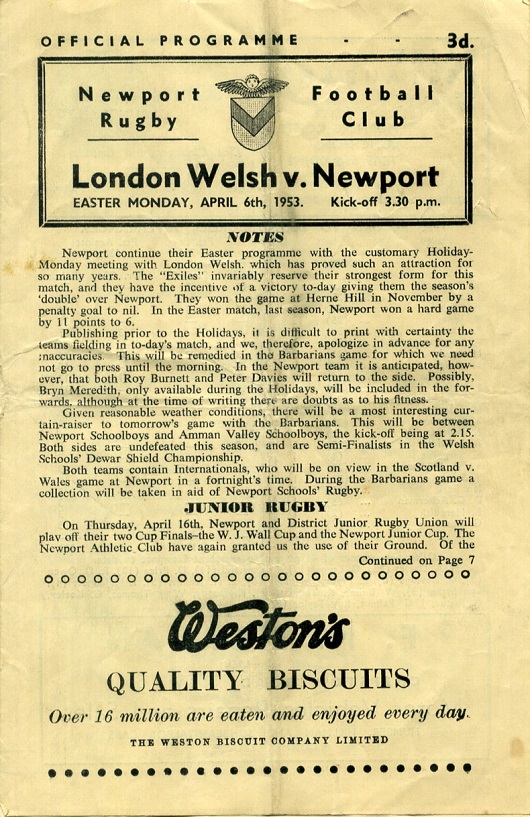 "Newport continue their Easter programme with the customary Holiday-Monday meeting with London Welsh, which has proved such an attraction for so many years. The "Exiles" invariably reserve their strongest form for this match, and they have the incentive of a victory to-day giving them the season’s 'double' over Newport. They won the game at Herne Hill in November by a penalty goal to nil. In the Easter match, last season, Newport won a hard game by 11 points to 6."