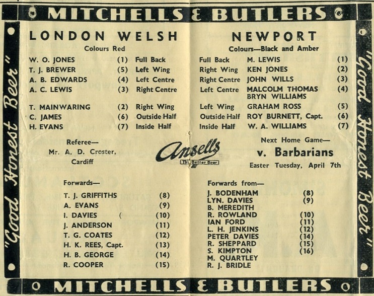 "Publishing prior to the Holidays, it is difficult to print with certainty the teams fielding in to-day’s match, and we, therefore, apologize in advance for any inaccuracies. This will be remedied in the Barbarians game for which we need not go to press until the morning. In the Newport team it is anticipated, however, that both Roy Burnett and Peter Davies will return to the side. Possibly, Bryn Meredith, only available during the Holidays, will be included in the forwards. although at the time of writing there are doubts as to his fitness."