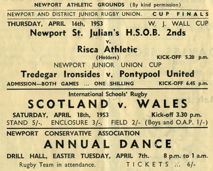 "Given reasonable weather conditions, there will be a most interesting curtain-raiser to tomorrow’s game with the Barbarians. This will be between Newport Schoolboys and Amman Valley Schoolboys, the kick-off being at 2.15. Both sides are undefeated this season, and arc Semi-Finalists in the Welsh Schools' Dewar Shield Championship."