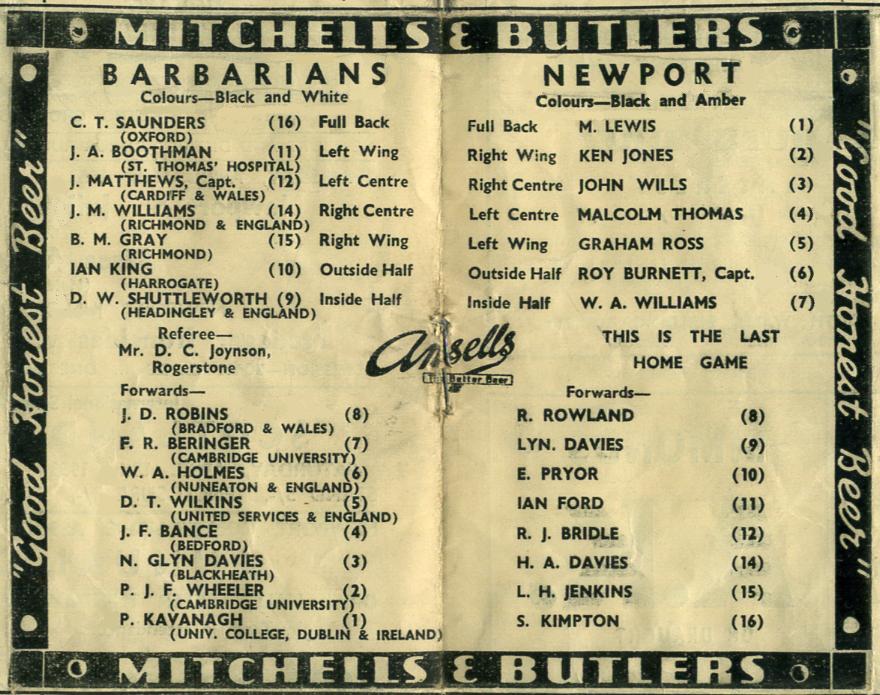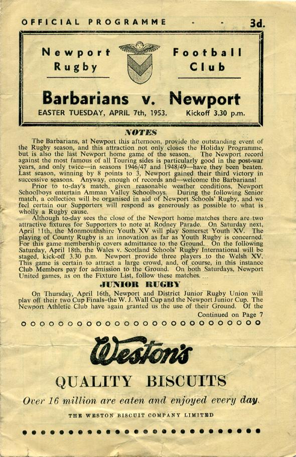 "The Barbarians, at Newport this afternoon, provide the outstanding event of the Rugby season, and this attraction not only closes the Holiday Programme, but is also the last Newport home game of the season. The Newport record against the most famous of all Touring sides is particularly good in the post-war years, and only twice - in seasons 1946/47 and 1948/49 - have they been beaten. Last season, winning by 8 points to 3, Newport gained their third victory in successive seasons. Anyway, enough of records and - welcome the Barbarians!"
