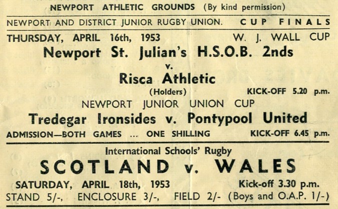 "On Thursday, April 16th, Newport and District Junior Rugby Union will plav off their two Cup Finals - the W. J. Wall Cup and the Newport Junior Cup. The Newport Athletic Club have again granted us the use of their Ground. Of the 4 teams competing, 3 are newcomers. In the W. J. Wall Cup Final, Risca Athletic (the holders) will be opposed by Newport St. Julian's H.S.O.B. 2nds. The kick-off will be 5.20 p.m. Mr. A. Williams (Newport Junior Union) will referee this game. In the Newport Junior Cup. Pontypool United will oppose Tredegar Ironsides. These teams are new entrants and both have defeated 3 teams to reach the final; Tredegar having won 3 games at home, and Pontypool 3 games all away, so a good game is anticipated. The Referee will be Mr. Vernon Parfitt (Welsh Rugby Union), Newport, and the kick-off will be at 6.45 p.m."
