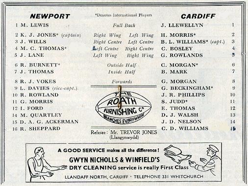 "Cardiff have been hit by injuries. The unfortunate Rex Willis chipped an elbow bone last Saturday and might be out for three weeks. His place will be taken by the loyal and hard working Brian Mark. In the pack, Sid Judd has gone into the second row and John Nelson, now recovered from his injury, goes into the No. 8 position."
