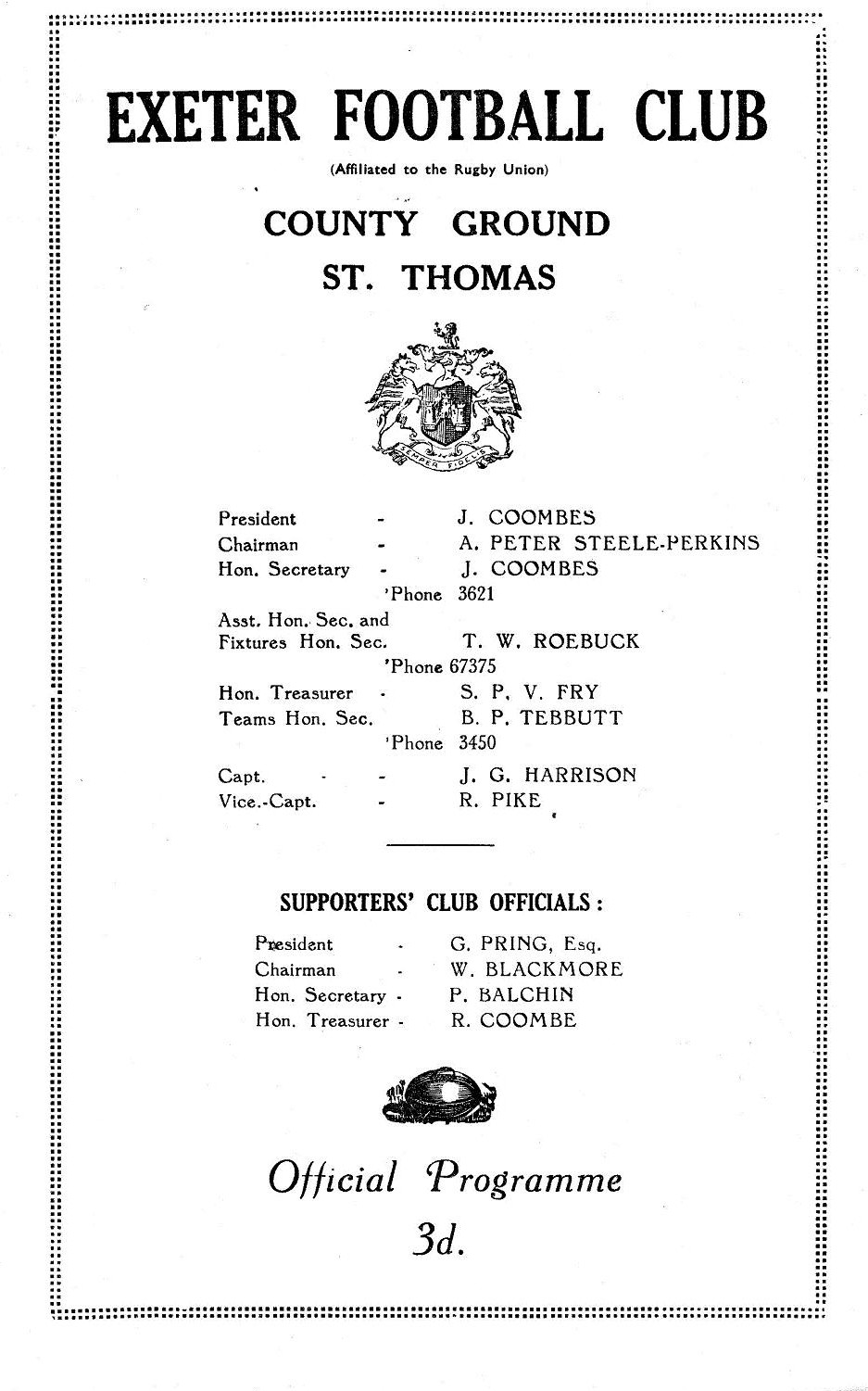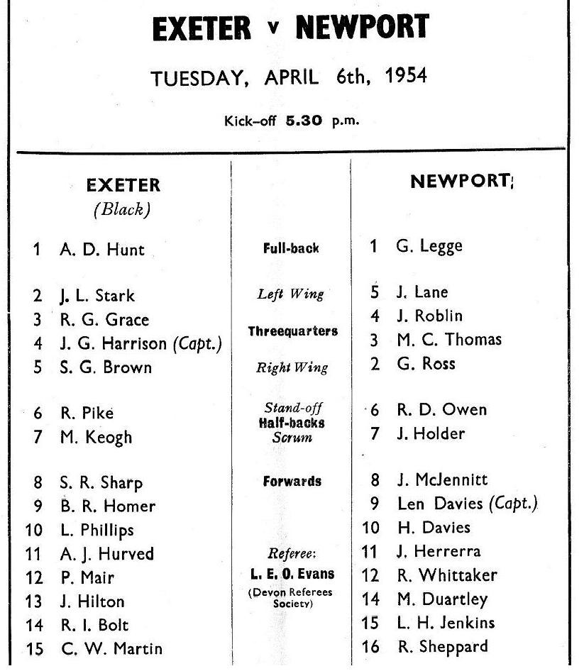 "NEWPORT. This word, which represents one of the finest Rugby Clubs in the world, conjures up many wonderful games played on the County Ground and a host of happy memories. Some of the greatest names in Rugby Football have appeared on their programmes and one of them is still there, K. Jones, their International wing has appeared in 35 Internationals and has been chosen as Captain of the Welsh side to meet France next Saturday. The fixture with Exeter has been of long standing and many happy friendships have been formed. So we give them a very hearty and warm welcome to-night."