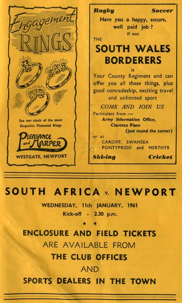 "The Newport team, also committed to three games over the week-end will show a few positional changes. Bryn Meredith is not available so Graham Bevan will substitute. It is possible that experiments may be made at outside-half today and tomorrow. It is imperative that we decide as soon as possible the composition of the team to meet the Springboks in a few weeks time. We should have a pointer to our chances after meeting Ebbw Vale last Saturday and Abertillery tomorrow. A Combined XV from these two Western Valley sides put up a glorious performance against the South Africans."