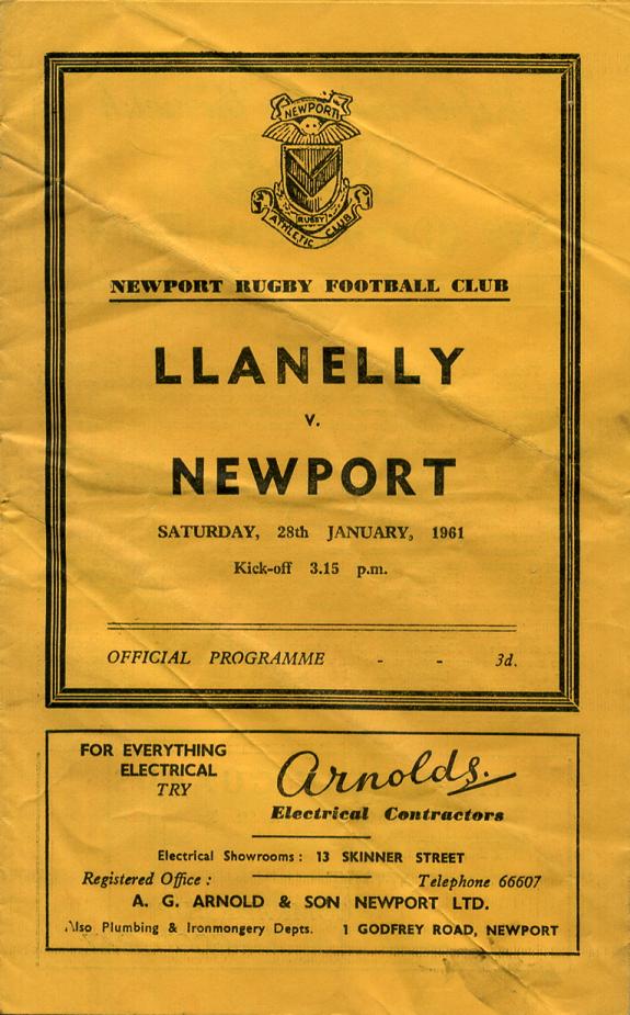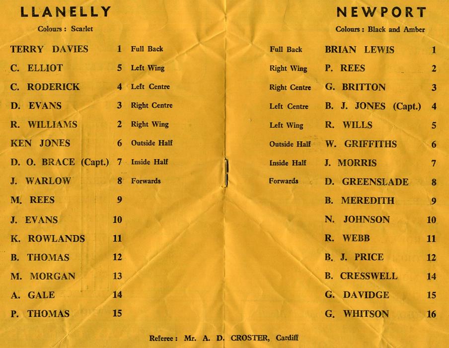 "Llanelly, a club with a great tradition, are always welcome to Rodney Parade. This season form-wise, they seem to be running in parallel with us. We have each played 27 and lost 8. R. H. Williams has retired from the field of play, but his great experience is being utilised administratively for the good of Welsh rugby. Onllwyn Brace is very popular with Newport rugby fans and his tactics about the field are followed keenly. Ray Williams has mentioned retirement over the last few years but he is still turning out and his displays on the wing are as incisive and dangerous as ever. Dennis Evans, an Ebbw Vale product, who was capped against the Springboks is a strong runner and likes to take the shortest way to the line. He has been invited to play for Monmouthshire against Glamorgan next Wednesday at Pontypool (Kick-off 3.45 p.m.). Keith Rowlands the giant second-row forward has been knocking at the door of the Welsh XV for the last few seasons."