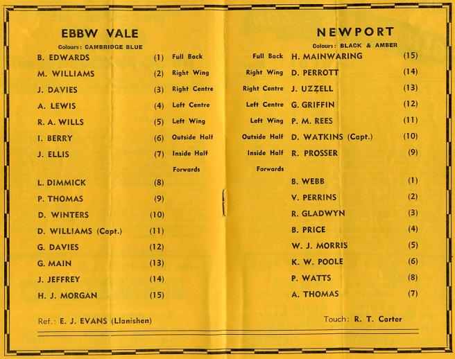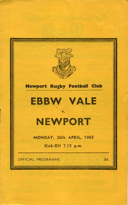"We are pleased to welcome our visitors from Ebbw Vale tonight, and we look forward to the usual good game they give us on their ground. This particular fixture has a jinx on it because the weather forced postponements on two occasions, the first time on December 28th and again on March 1st. In October we went up to the Welfare Ground and we won handsomely, but quite unexpectedly, by 23 pts. to 5 pts. Last season we won here by 12 pts. to nil, but lost at Ebbw Vale 6 pts. to nil. The "Steelworkers" have suffered a series of misfortunes throughout the season with injuries and illness. Their 1964/65 record is not as formidable as usual and reads, played 40, Won 18, Drawn 4 and Lost 18, Pts. for 413 and Pts. against 384."