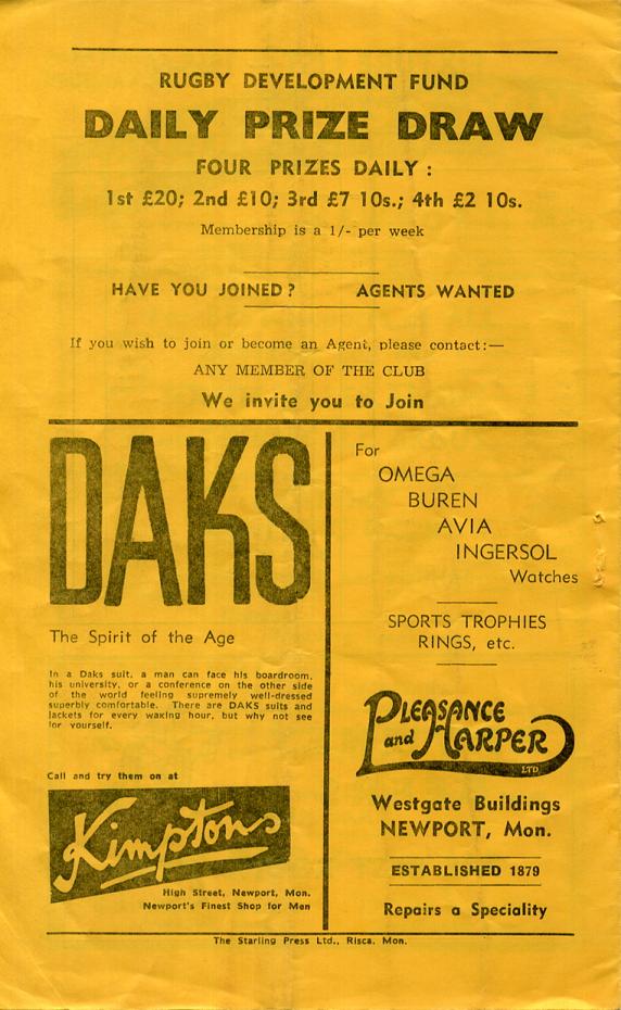 "On October 20th, we play a Combined Army and Blackheath XV on this ground. This is a Memorial Match to the late Col. J. E. C. Partridge, D.L. The referee for this game is the Rugby Union President, Air Marshal Augustus Walker, K.C.B., C.B.E., D.S.O., D.F.C., A.F.C. Our game next Monday at Penarth has been switched to this ground. This will be an " all pay" game with all gate monies going to the Penarth R.F.C. Teas are now on sale in the Rodney Hall, at reasonable prices, after the game. Unheralded, our new score board came succesfully into operation last Saturday. A collection will be made today to help towards the cost of running our broadcast to hospitals, and we appeal for a generous response."