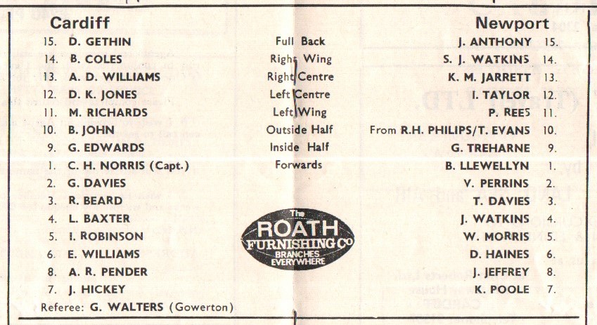 “This was not borne out in last Saturday’s international when the Triple Crown was at stake, but then there was no chance for tension to build up as the result was beyond dispute shortly after half-time. A third of that Welsh team will be appearing this evening and it is appropriate to congratulate all five players namely Gareth Edwards, Keith Jarrett, Barry John, Stuart Watkins and Maurice Richards on their performances in that game. The feat of the latter in scoring four tries in an international was quite extraordinary, but it would be churlish to single out individuals as it was essentially a team victory.”