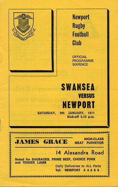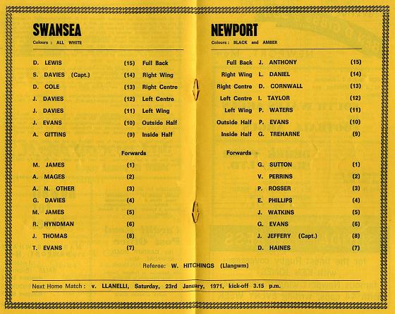 "On September 26th we travelled West to the St. Helens ground full of confidence to play our eighth game of the season, with a record of six wins and one draw to our credit. The revitalised Swansea XV, after several years in the doldrums halted us in no mean fashion, winning by 24pts to 12pts. We as a club are pleased that proud Swansea are again taking their rightful place in Welsh Rugby. Besides our scalp they have humbled Cardiff and their near neighbours Llanelli and as recent as last Saturday, with Welsh Trial calls and several players absent through injury and sickness they went to Pontypool and won 17pts to nil. We are keen to reverse our defeat, but are conscious of the fact that the All Whites, are hungry for the double."