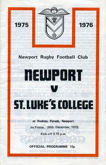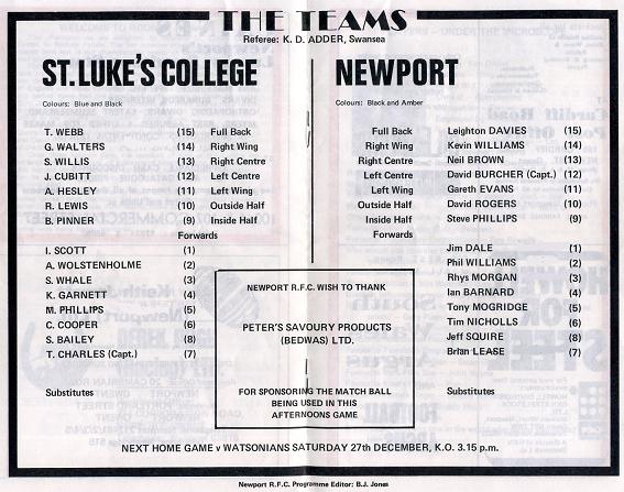 "This afternoon we are delighted to welcome St. Luke's College, Exeter, to Rodney Parade. The last occasion this 'Acadamy of Learning' played here was in our championship season of 1968-69. The result on that occasion was a victory for the Black & Ambers by 26 pts. to 13 pts."