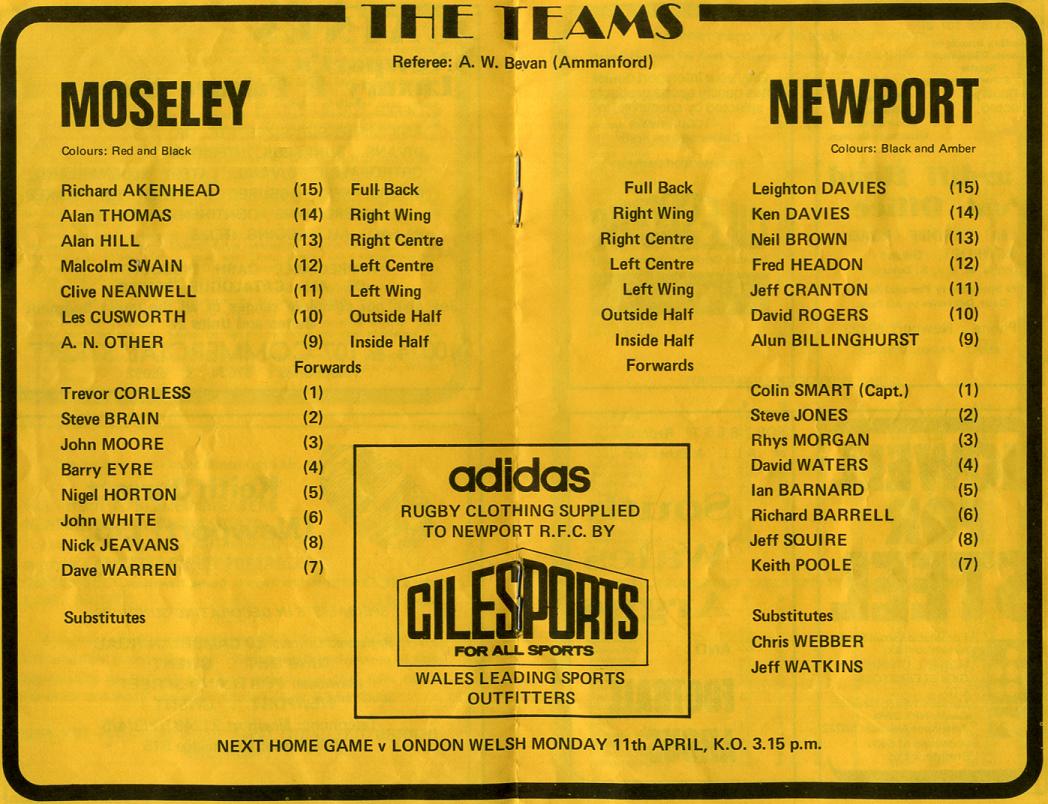 "These three players will quickly point out that their International recognition would have been impossible if it had not been for the other members of the team. Full back Richard Akenhead has scored many points through his boot this season, memories of Sam Doble, while wingers Alan Thomas and Rudi Smith know the quickest way to the line. Scrum half Chris Gifford has been a major inspiration to the side in his partnership with Martin Cooper. But no side can operate without the ball and Moseley have a fine pack to provide it. Barry Ayre was close to joining his skipper in the England side this season, while Steve King still came under the scrutiny of the Big 5."