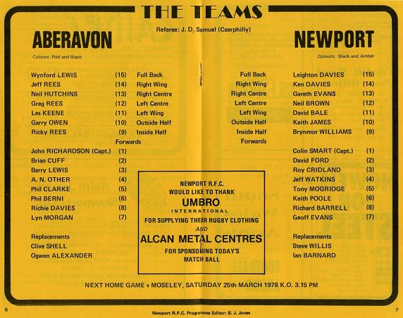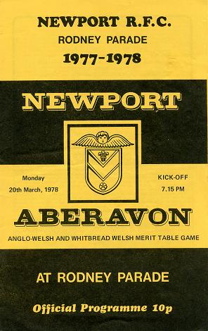 "Defeat at the Talbot Athletic Ground by Bridgend a week last Saturday cost tonight's visitors to Rodney Parade, the top of the table spot in the Anglo-Welsh Merit Table. During the last few seasons 'the Wizards' have had the 'bridesmaids' tag to contend with, having been runners-up in the W.R.U. Challenge Cup on two occasions as well as getting close to carrying off the Clubs Championship. Formed in 1876, Aberavon are convinced that this season they will carry off one of the big prizes, the cup, the championship or one of the Merit Tables. Any Newport supporter who saw them destroy Newport at Aberavon on the 10th December 1977, by 17pts to 4pts, will find it difficult to argue."
