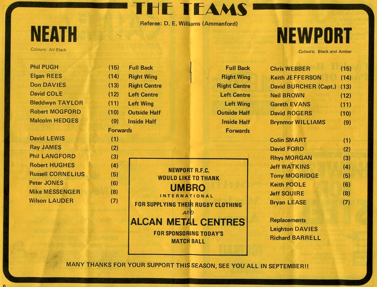 "Since our two clubs first met in 1878-79, we have played 143 games with the Black and Ambers winning 78, the All Blacks 51 and 12 being Drawn. Like all our other visitors, Neath have found victories at Rodney Parade hard to come by, in actual fact they have only achieved 8, the last being in 1972-73."