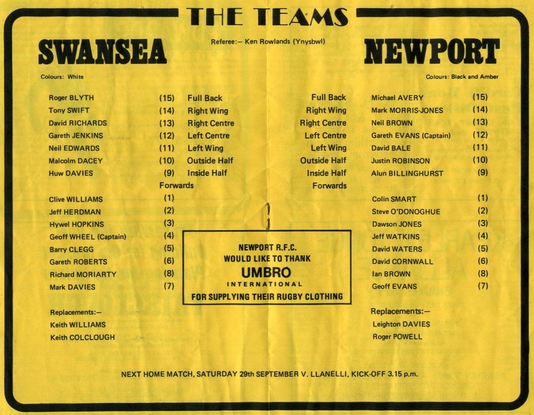 "Following their unbeaten tour of the Far East during August, Swansea look well set for honours both as a team and individually. Congratulations must be extended to Tony Swift and Trevor Cheeseman on their selection in the England "B" team. Welcome Swansea, your victories at Rodney Parade have been few since the last war, you can be certain the Black and Ambers will try to keep it that way today."