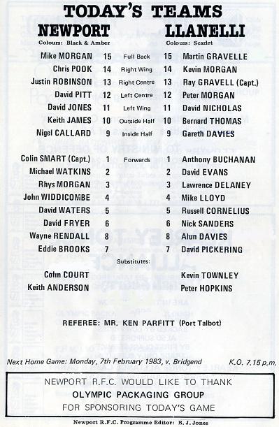 "Tonight gives everyone at Rodney Parade the opportunity of expressing their sympathy to Llanelli on the loss of their President, Carwyn James. His sudden death leaves a great gap at Stradey Park, and rugby football throughout the world has lost one of its great thinkers and coaches. Llanelli and world rugby also suffered a loss with the death of Ivor Jones, who had a great bearing on rugby throughout the world. Our sympathy to the families of both these Great Rugby Men, and long may their memories remain with us. Croeso Llanelli."