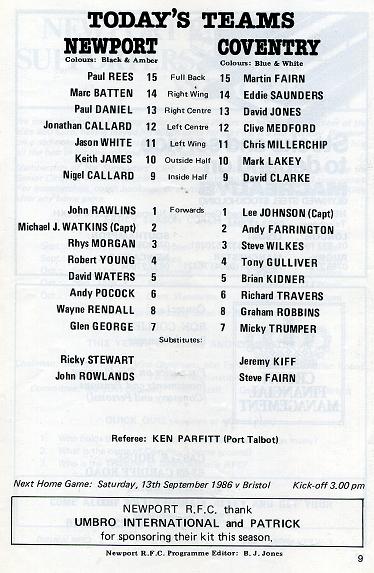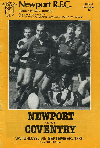 "THIS AFTERNOON we extend a very warm welcome to our friends from Coventry, under the captaincy of Lee Johnson. Lee is in his second successive season as captain and will be looking for his team to continue achieving results and playing the attractive style of rugby that gave them a 49pts to 3pts victory over Walsall earlier this week. He will also be hoping to impress himself and regain a place in the England Squad for the Home International Series and World Cup. No. 8 Graham Bobbins, who scored a hat trick of tries verus Walsall will also be hoping to add to his two appearances for England and will need careful looking after this afternoon. A familiar face to the Rodney Parade faithfuls in the person of centre threequarter David Jones, who will be anxious to display his attacking ability against his old club, while the talented wing Eddie Saunders must be given little room to use his pace. One familiar face likely to be missing this afternoon is England hooker Steve Brain, who has just returned from coaching in America and is not expected to return to 1st XV games for a few weeks. His replacement, Andy Farrington, is considered by many critics to have a bright future and his confrontation with 'MJW' should provide a pointer."