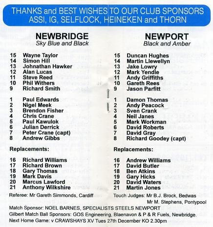 "At the moment, Newport are the strongest side in the Heineken League Division One holding up the other 11 teams! And, oh dear, last week's exit from the SWALEC Cup is best forgotten. For a club that has so many trophies and international caps to display it is sad and disappointing that fortunes are not kinder. Newbridge RFC are only two points better in the League, but Newport have a game in hand. What a state of affairs for Gwent rugby, before we even look at Abertillery and Pontypool. However, not to despair Santa is coming down the chimney on the 25th with a sackful of rugby skills!"