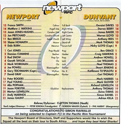 "Nicky Lloyd, a former favourite with Newport supporters for his commitment and tenacity led the side last week when he was partnered by Mark Thomas, a loyal servant of the club, who is their top scorer in the league with 81 points. Anthony Rees and Darren Berry are lively wingers whilst in the pack Dunvant rely heavily on Kati Tu'ipulotu, their Tongan No. 8 and Welsh under 21 hooker Craig Hawkins. Emori Katalau, at lock, another South Sea Islander has already returned home but prop Faletau remains and from that position he has scored four league tries including two at Stradey Park. However he may be absent today as an ankle injury caused him to retire after only 5 minutes against Cardiff last week."