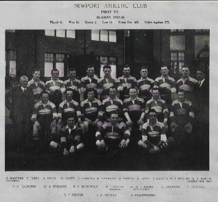Harold Davies captained the side in 1925-26 and Newport ended with their 2nd worst ever season to date. The forwards did not perform as expected and contained a number of old stalwarts - Jack Whitfield, Neil MacPherson (who had been playing since 1913) and Dr. W. Roche who struggled to retain their form. Wing George Andrews headed the try list with 24 followed by Albert Stock with 20 and also 2dg. Captain Harold Davies scored 13t, 4c, 1p and 2dg.