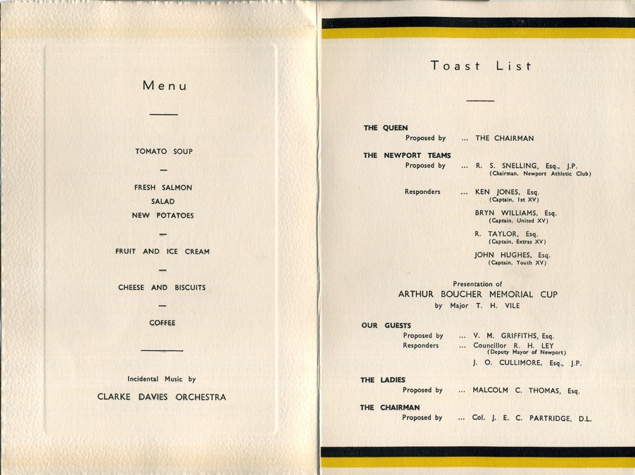 Names like Brian Jones, Onllwyn Brace and Garfield Owen began to appear and yet another great hooker had been discovered with Bryn Meredith. College claims on Leighton Jenkins and Bryn Meredith, who won their first Welsh caps, hindered Newport as did fullback and centre problems but a youngster from Llanharan, a certain Garfield Owen, was to solve the former and was picked to play against the Barbarians.