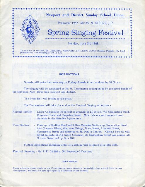 Monday, 3rd. June saw the Newport and District Sunday School Union's 'Spring Singing Festival' return to Rodney Parade.